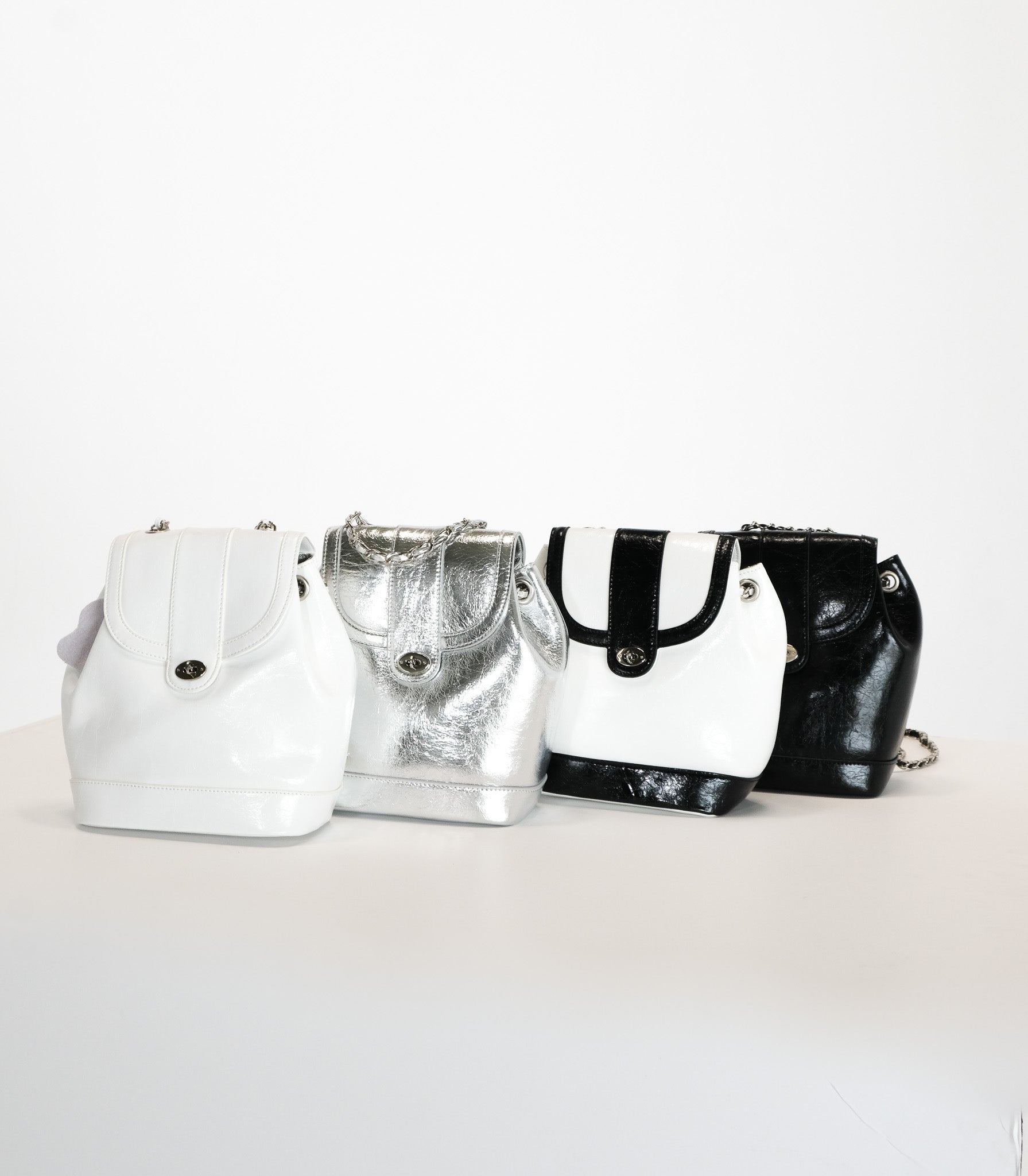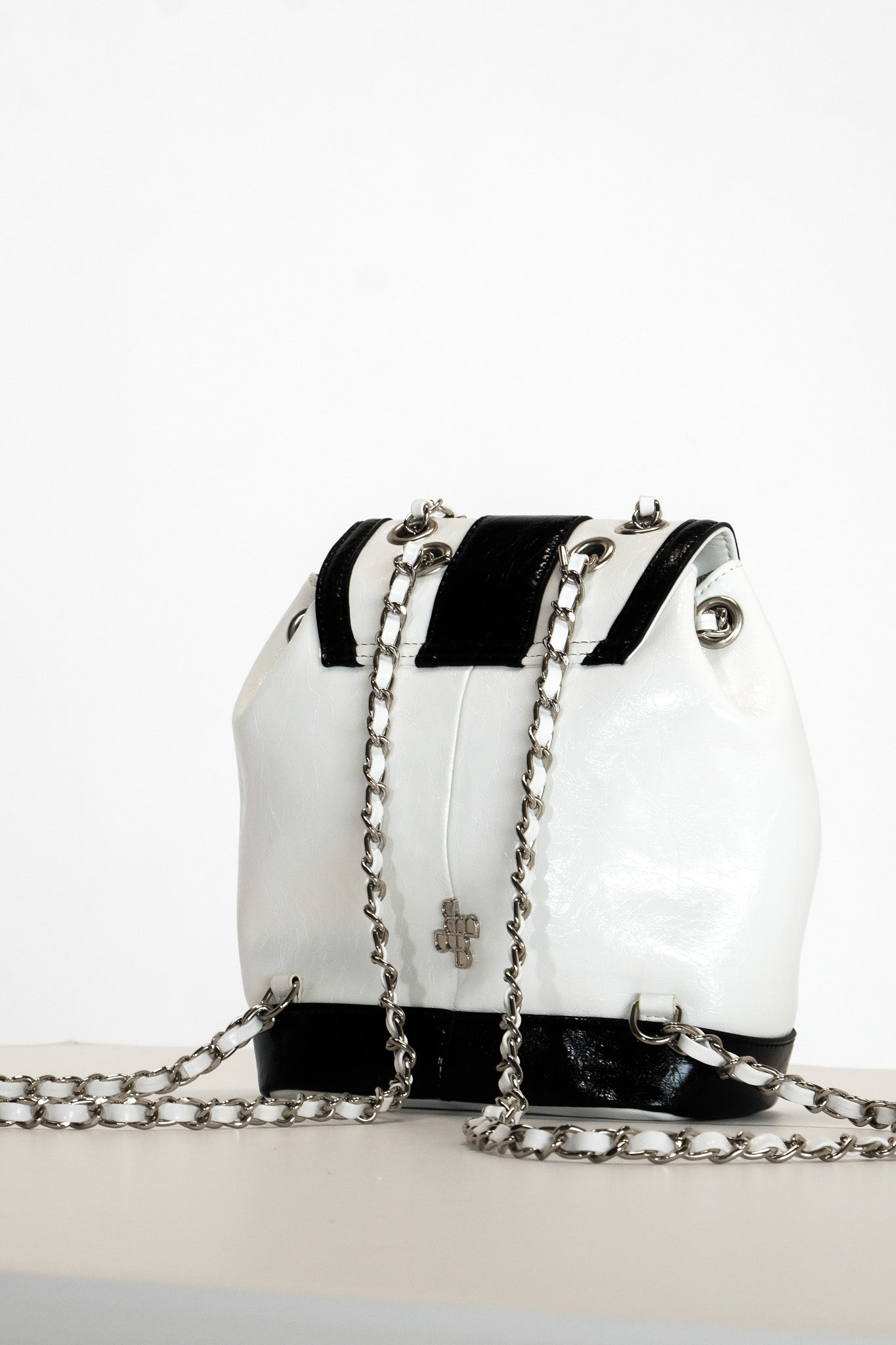 Add some edge to your look with the M055 Saddle Backpack. With a durable chain and plenty of space for small items, this backpack is perfect for those without pockets. Choose from the dazzling silver or playful black and white option. Our personal favorite? The silver, of course!